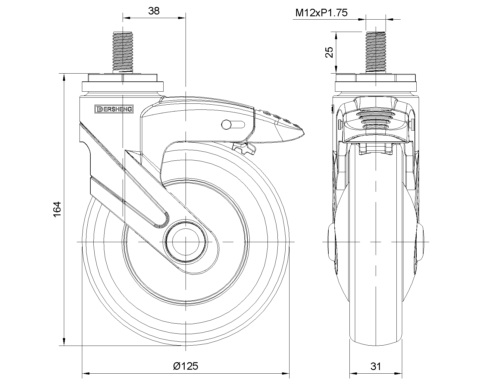 Hệ thống bánh xe khóa kép, ren M12x25 Chân màu đen gia cố bằng polyamide, lắp ren Chống gỉ, chống ăn mòn, thẩm mỹ, tiết kiệm và cho phép quay trơn tru Lõi bánh xe bằng polypropylene chống va đập, bề mặt bánh xe bằng nhựa nhiệt dẻo đàn hồi (TPR) Bánh xe màu đen, loại ống tâm |