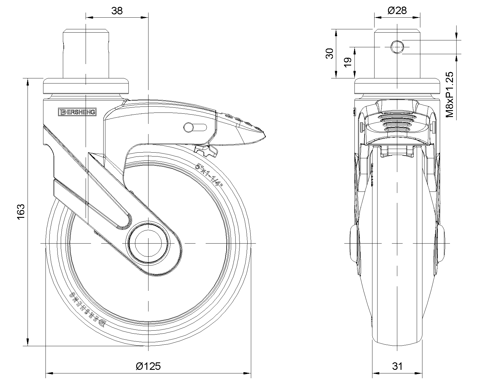 Bánh xe có hệ thống khóa phanh kép, chốt cài—Ø28x30L Chân màu đen gia cố bằng polyamide, lắp đặt chốt cài Chống gỉ, chống ăn mòn, thẩm mỹ, tiết kiệm và cho phép xoay trơn tru Lõi bánh xe bằng polypropylene chống va đập, bề mặt bánh xe bằng nhựa nhiệt dẻo đàn hồi (TPR) Bánh xe màu đen—loại ống tâm |