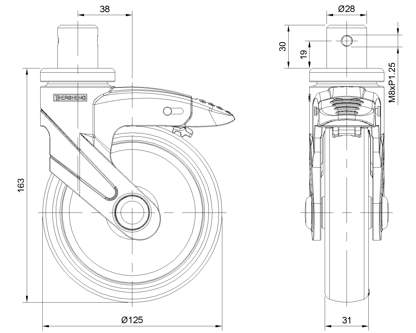 Bánh xe có hệ thống khóa phanh kép, chốt cài—Ø28x30L Chân màu đen gia cố bằng polyamide, lắp đặt chốt cài Chống gỉ, chống ăn mòn, thẩm mỹ, tiết kiệm và cho phép xoay trơn tru Lõi bánh xe bằng polypropylene chống va đập, bề mặt bánh xe bằng nhựa nhiệt dẻo đàn hồi (TPR) Bánh xe màu đen—loại ống tâm |