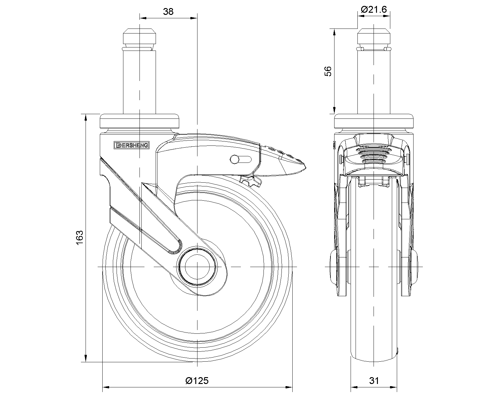 Bánh xe có hệ thống khóa phanh kép, Ø21.6x56L, có vòng đệm chữ C Chân màu đen gia cố bằng polyamide, lắp đặt bằng phích cắm Chống gỉ, chống ăn mòn, thẩm mỹ, tiết kiệm và xoay êm ái Lõi bánh xe bằng polypropylen chống va đập, bề mặt bánh xe bằng nhựa nhiệt dẻo đàn hồi (TPR) Bánh xe màu đen, loại ống tâm |