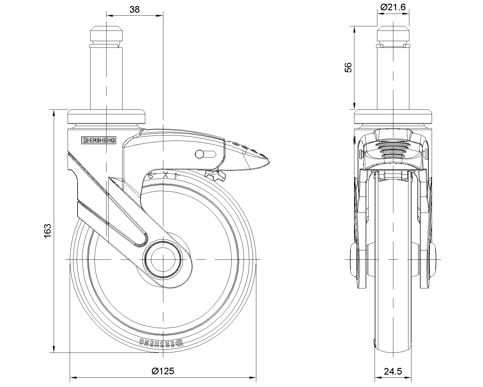 Bánh xe có hệ thống khóa phanh kép, Ø21.6x56L, có vòng đệm chữ C Chân màu đen gia cố bằng polyamide, lắp đặt bằng phích cắm Chống gỉ, chống ăn mòn, thẩm mỹ, tiết kiệm và xoay êm ái Lõi bánh xe bằng polypropylen chống va đập, bề mặt bánh xe bằng nhựa nhiệt dẻo đàn hồi (TPR) Bánh xe màu đen, loại ống tâm |