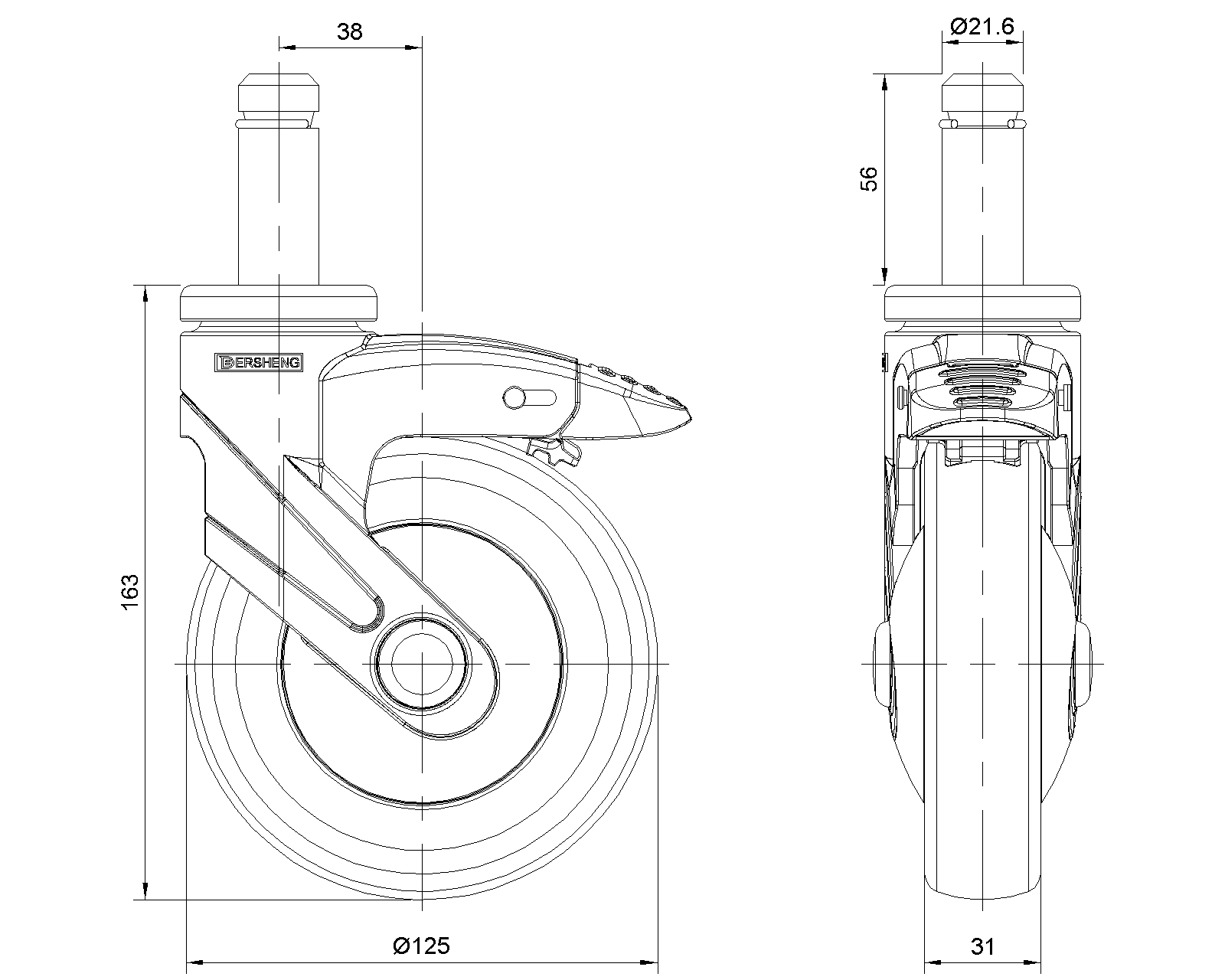 Bánh xe có hệ thống khóa phanh kép, Ø21.6x56L, có vòng đệm chữ C Đế màu đen làm bằng vật liệu gia cố polyamide, lắp đặt bằng phích cắm Chống gỉ, chống ăn mòn, thẩm mỹ, tiết kiệm và quay êm ái Lõi bánh xe bằng polypropylen chống va đập, bề mặt bánh xe bằng nhựa nhiệt dẻo đàn hồi (TPR) Vòng bi bánh xe màu đen—vòng bi chính xác |