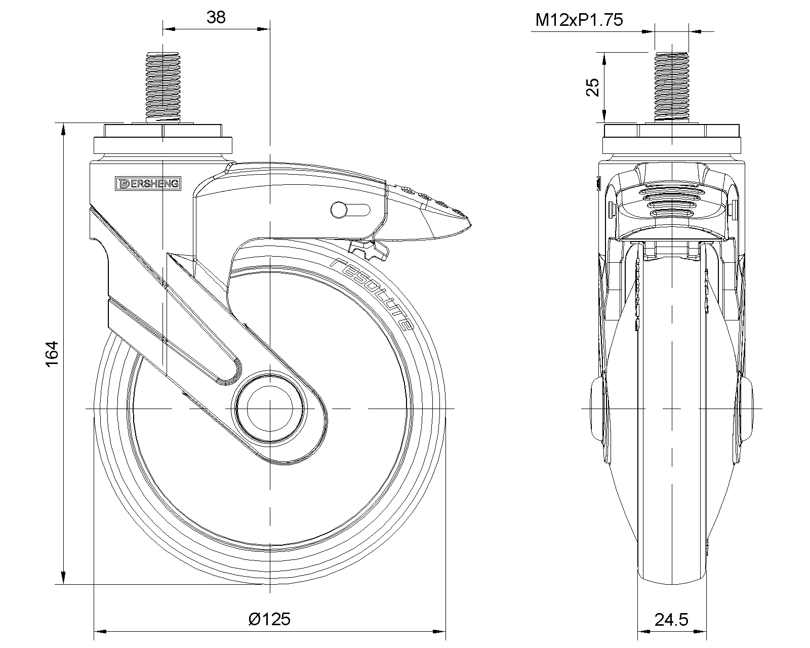 Bánh xe hệ thống khóa phanh kép, ren M12x25 Chân màu đen làm bằng vật liệu gia cường polyamide, lắp ren Chống gỉ, chống ăn mòn, thẩm mỹ, tiết kiệm và cho phép quay trơn tru Lõi bánh xe bằng polypropylene chống va đập, bề mặt bánh xe bằng nhựa nhiệt dẻo đàn hồi (TPR) Vòng bi bánh xe màu đen—vòng bi chính xác |