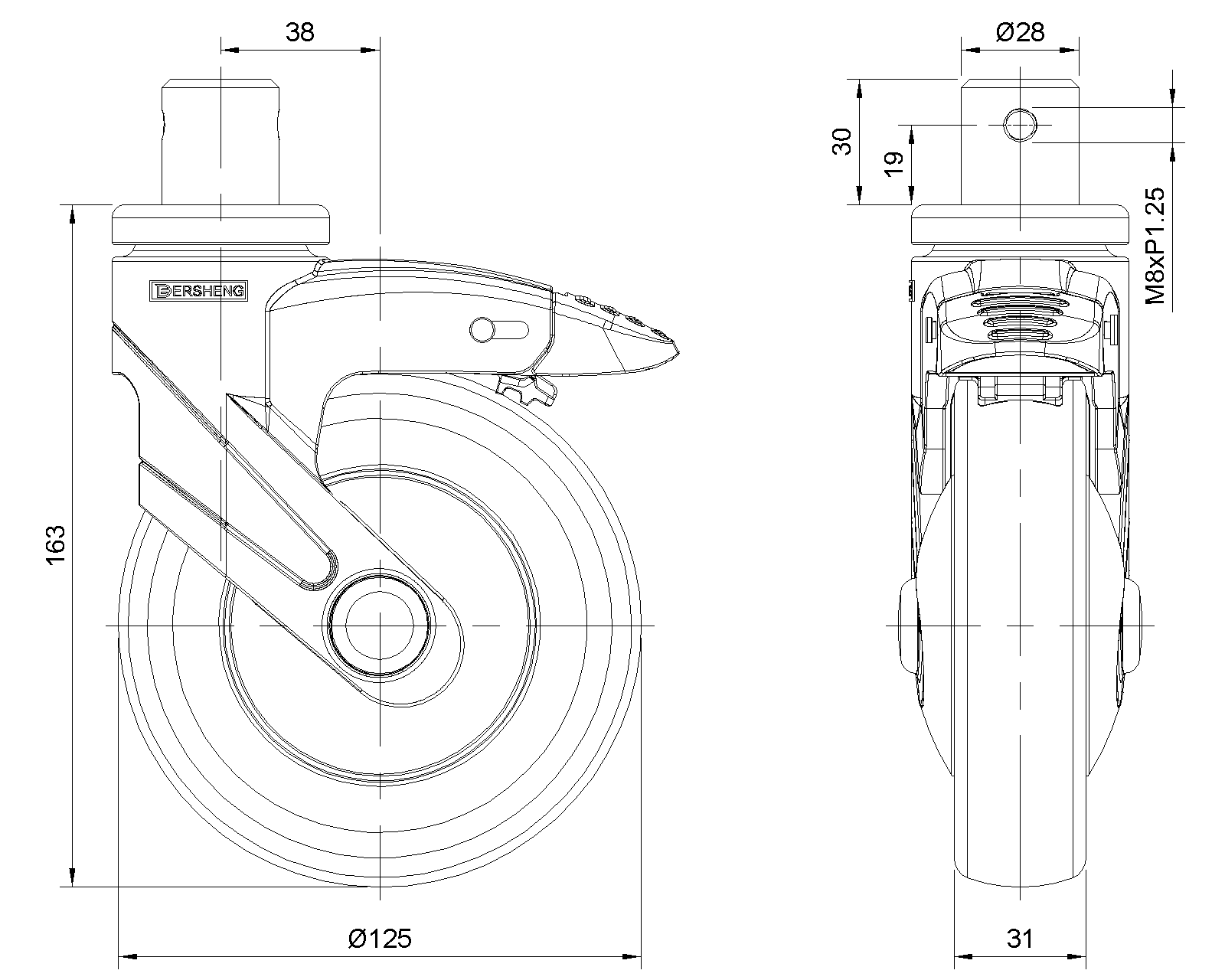 Bánh xe có hệ thống khóa phanh kép, chốt cài—Ø28x30L Chân màu đen gia cố bằng polyamide, lắp đặt chốt cài Chống gỉ, chống ăn mòn, thẩm mỹ, tiết kiệm và cho phép xoay trơn tru Lõi bánh xe bằng polypropylene chống va đập, bề mặt bánh xe bằng nhựa nhiệt dẻo đàn hồi (TPR) Bánh xe màu đen—loại ống tâm |
