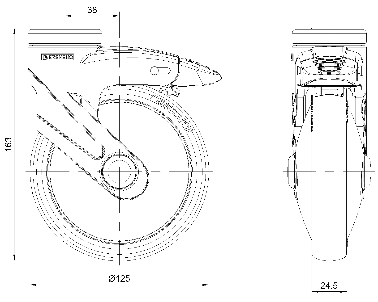 Bánh xe có hệ thống khóa phanh kép, đinh tán rỗng—lỗ Ø12,2 Chân màu đen được gia cố bằng polyamide, lắp đặt khóa Chống gỉ, chống ăn mòn, thẩm mỹ, tiết kiệm và xoay trơn tru Lõi bánh xe bằng polypropylen chống va đập, bề mặt bánh xe bằng nhựa nhiệt dẻo đàn hồi (TPR) Bánh xe màu đen—loại ống trung tâm |