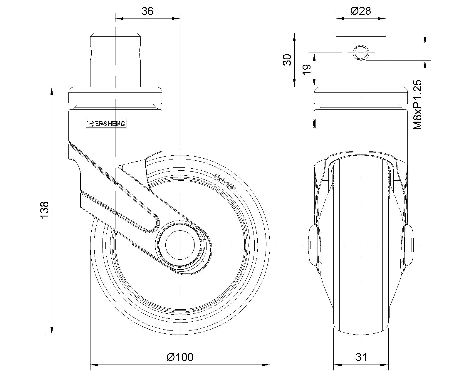 Bánh xe di động, loại đinh tán—Ø28x30L Chân màu đen làm bằng polyamide gia cố, lắp đặt kiểu xoay Chống gỉ, chống ăn mòn, thẩm mỹ, tiết kiệm và cho phép xoay trơn tru Lõi bánh xe bằng polypropylene chống va đập, bề mặt bánh xe bằng nhựa nhiệt dẻo đàn hồi (TPR) Bánh xe màu đen—loại ống trung tâm |