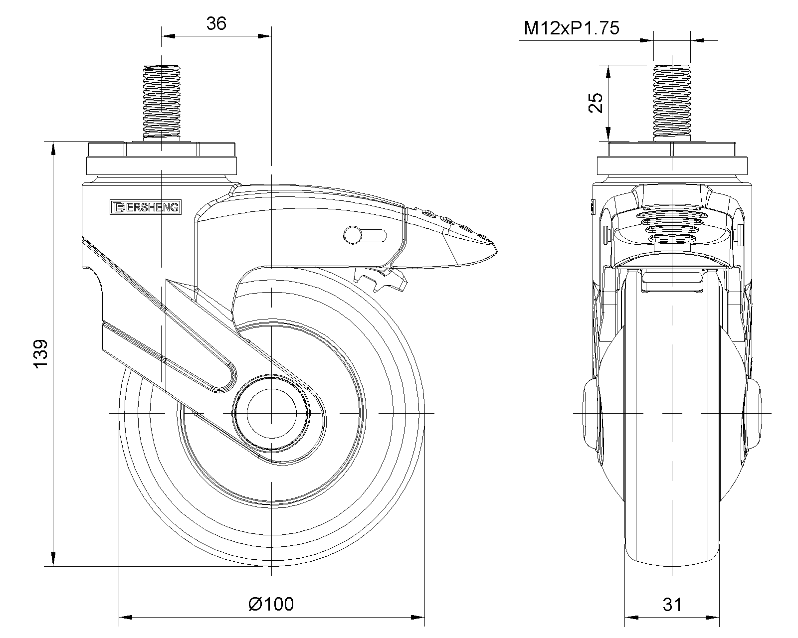 Bánh xe hệ thống khóa phanh kép, ren M12x25 Chân màu đen gia cố bằng polyamide, lắp ren Chống gỉ, chống ăn mòn, thẩm mỹ, tiết kiệm và cho phép xoay trơn tru Lõi bánh xe bằng polypropylene chống va đập, bề mặt bánh xe bằng nhựa nhiệt dẻo đàn hồi (TPR) Đen, ổ trục bánh xe—loại ống trung tâm |