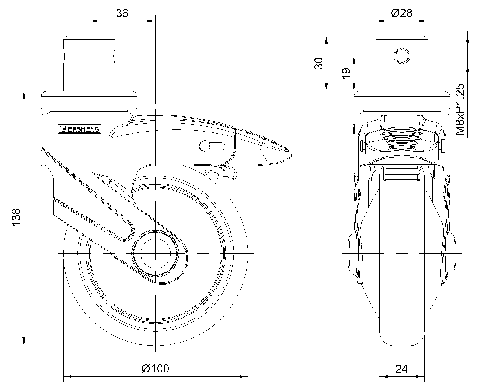 Bánh xe có hệ thống khóa phanh kép, chốt đinh tán—Ø28x30L Chân màu đen được gia cố bằng polyamide, thiết kế lắp chốt Chống gỉ, chống ăn mòn, thẩm mỹ, tiết kiệm và cho phép xoay trơn tru Lõi bánh xe bằng polypropylen chống va đập, bề mặt bánh xe bằng nhựa nhiệt dẻo đàn hồi (TPR) Bánh xe màu đen—loại ống trung tâm |