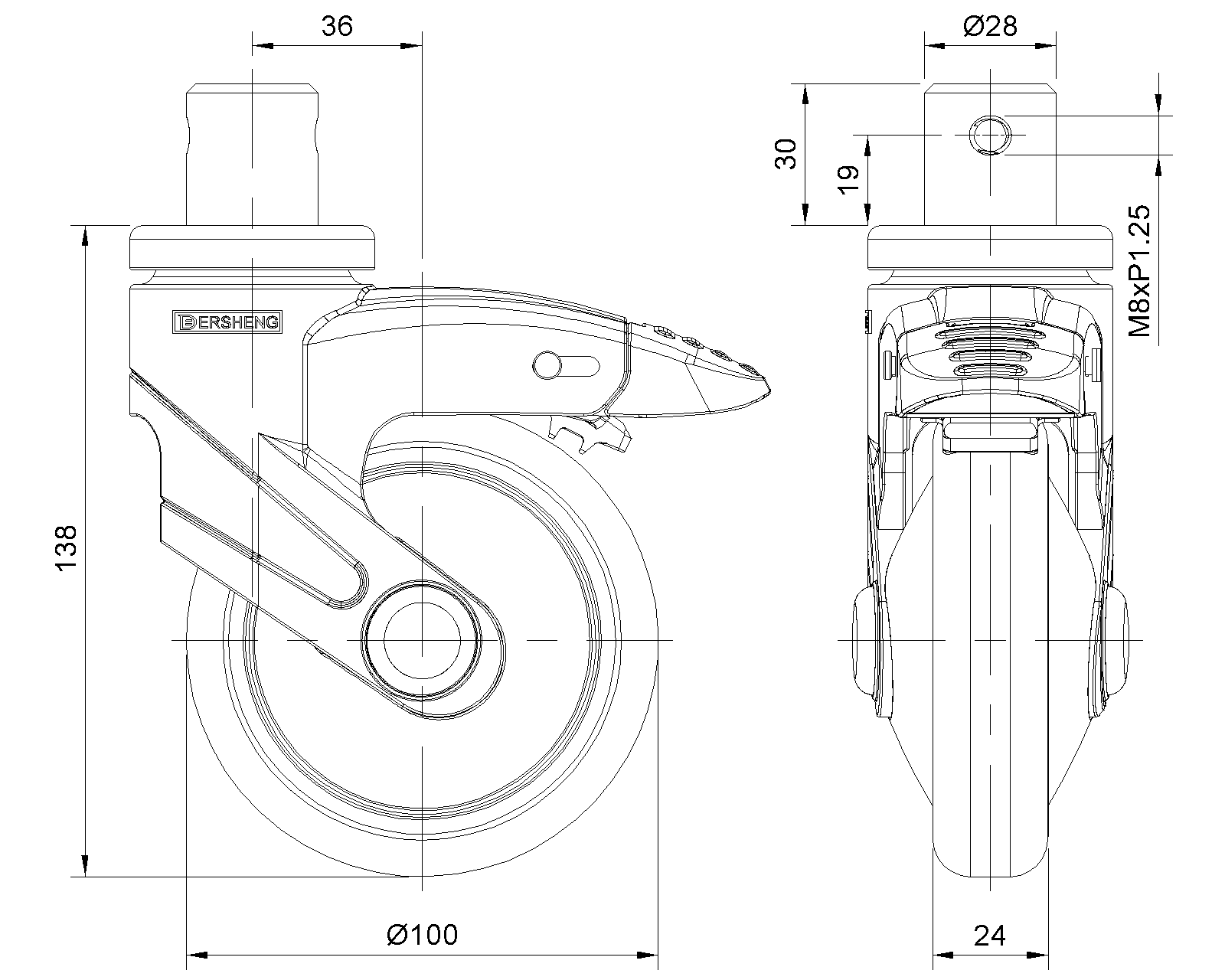 Bánh xe có hệ thống khóa phanh kép, chốt đinh tán—Ø28x30L Chân màu đen làm bằng vật liệu gia cố polyamide, lắp đặt bằng chốt Chống gỉ, chống ăn mòn, thẩm mỹ, tiết kiệm và cho phép quay trơn tru Lõi bánh xe bằng polypropylene chống va đập, bề mặt bánh xe bằng nhựa nhiệt dẻo đàn hồi (TPR) Vòng bi bánh xe màu đen—vòng bi chính xác |