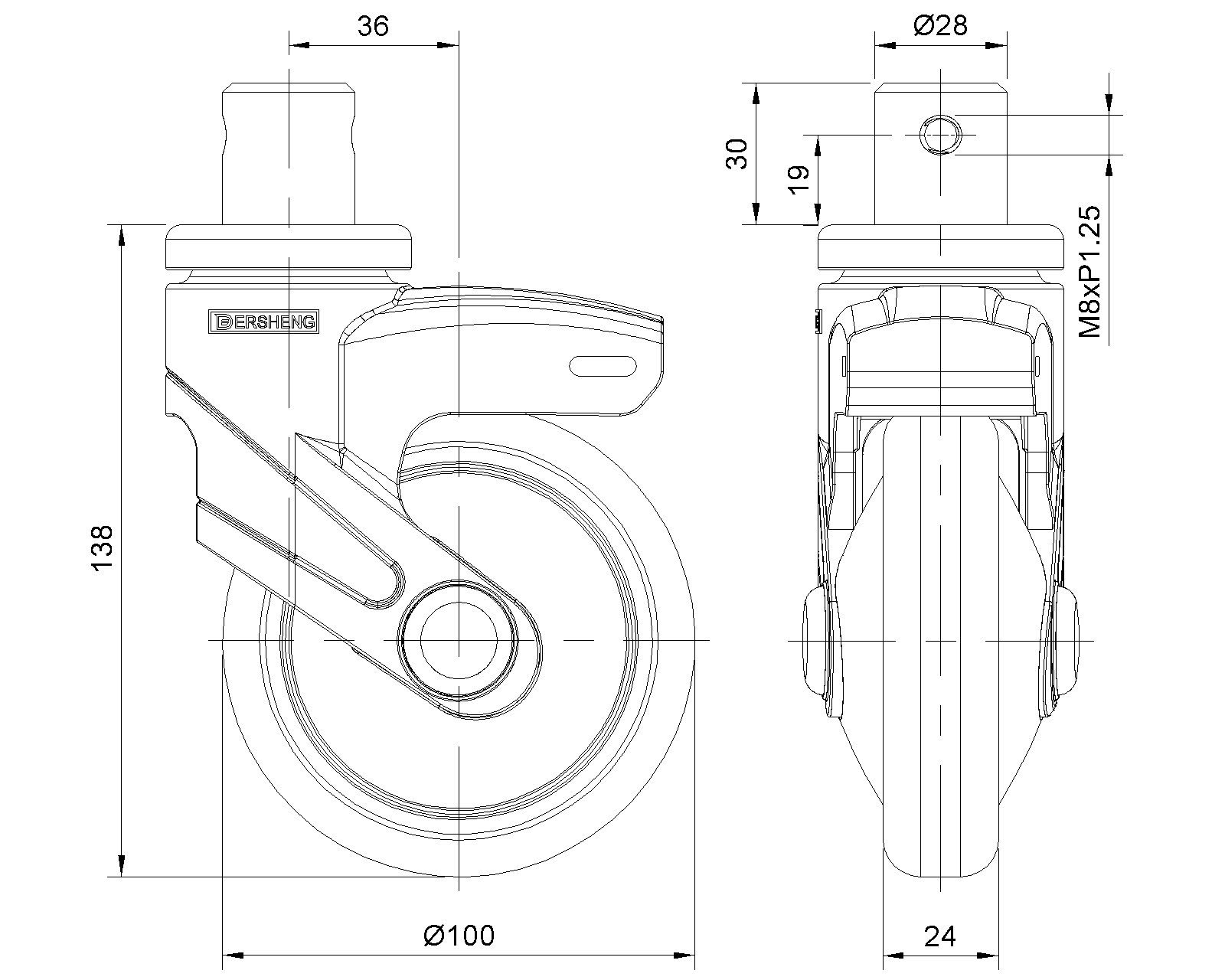 | Bánh xe cố định, đinh tán chốt—Ø28x30L Chân màu đen làm bằng vật liệu polyamide gia cường, lắp chốt. Chống gỉ, chống ăn mòn, thẩm mỹ, tiết kiệm và cho phép xoay trơn tru. Lõi bánh xe bằng polypropylen chống va đập, bề mặt bánh xe bằng nhựa nhiệt dẻo đàn hồi (TPR). Vòng bi bánh xe màu đen—vòng bi chính xác. |