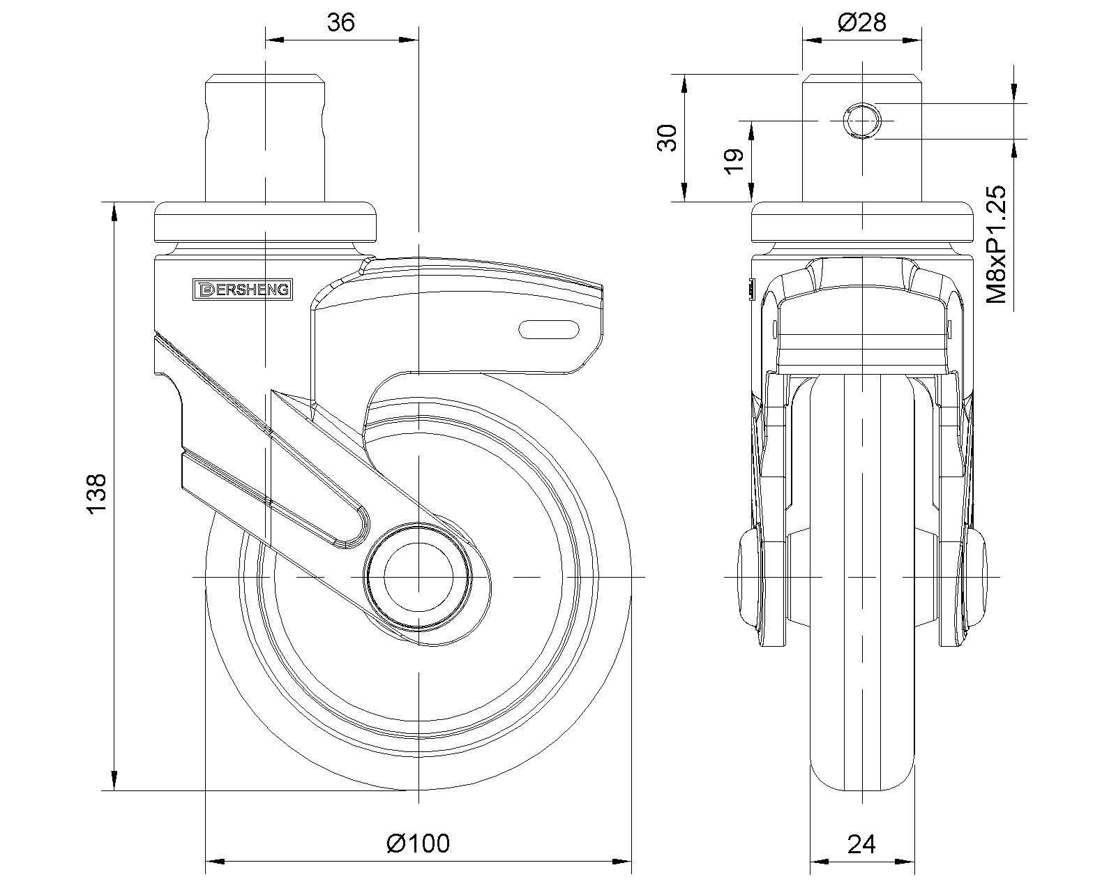 | Bánh xe cố định, đinh tán chốt—Ø28x30L Chân màu đen làm bằng vật liệu polyamide gia cường, lắp đặt bằng chốt Chống gỉ, chống ăn mòn, thẩm mỹ, tiết kiệm và cho phép xoay trơn tru Lõi bánh xe bằng polypropylen chống va đập, bề mặt bánh xe bằng nhựa nhiệt dẻo đàn hồi (TPR) Bánh xe màu đen—loại ống trung tâm |