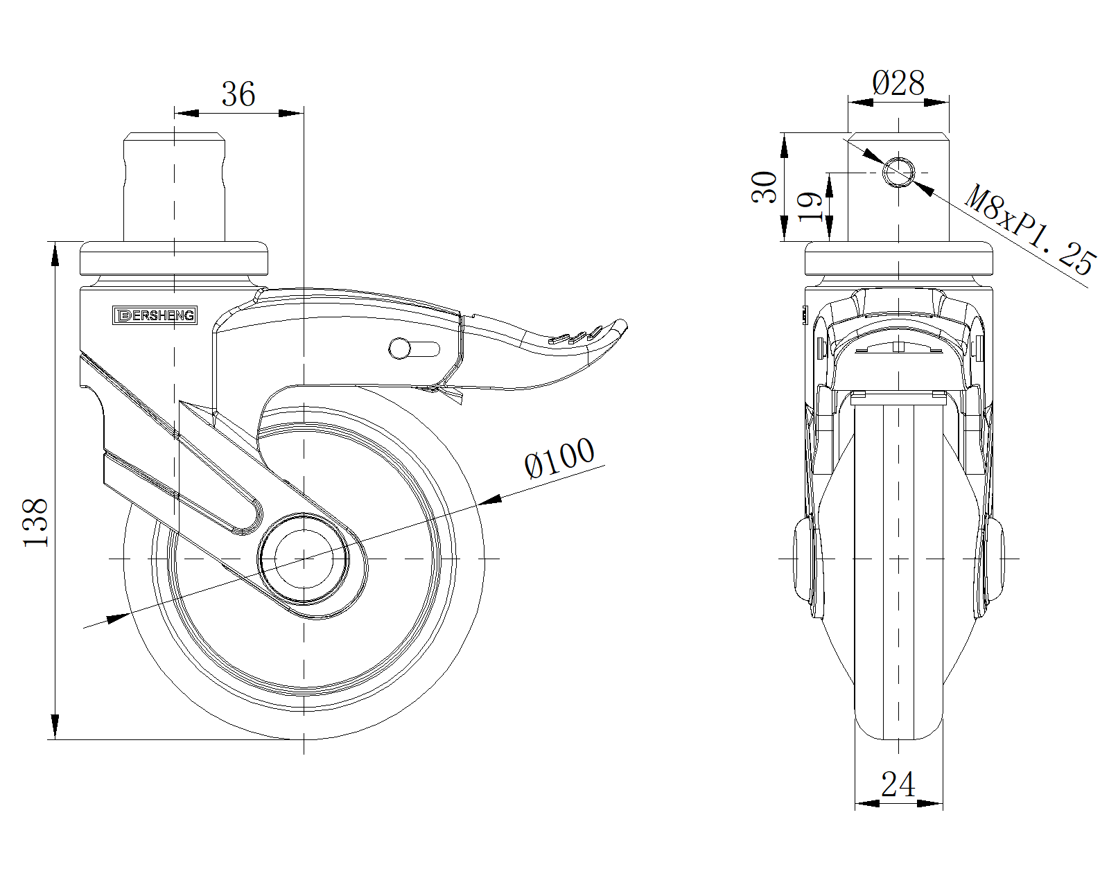 Bánh xe có hệ thống khóa phanh định hướng, chốt định vị Ø28x30L Chân bánh xe màu đen làm bằng vật liệu gia cố polyamide, lắp chốt định vị. Chống gỉ, chống ăn mòn, thẩm mỹ, tiết kiệm và cho phép xoay trơn tru. Lõi bánh xe bằng polypropylen chống va đập, bề mặt bánh xe bằng nhựa nhiệt dẻo đàn hồi (TPR). Vòng bi bánh xe màu đen—vòng bi chính xác. |