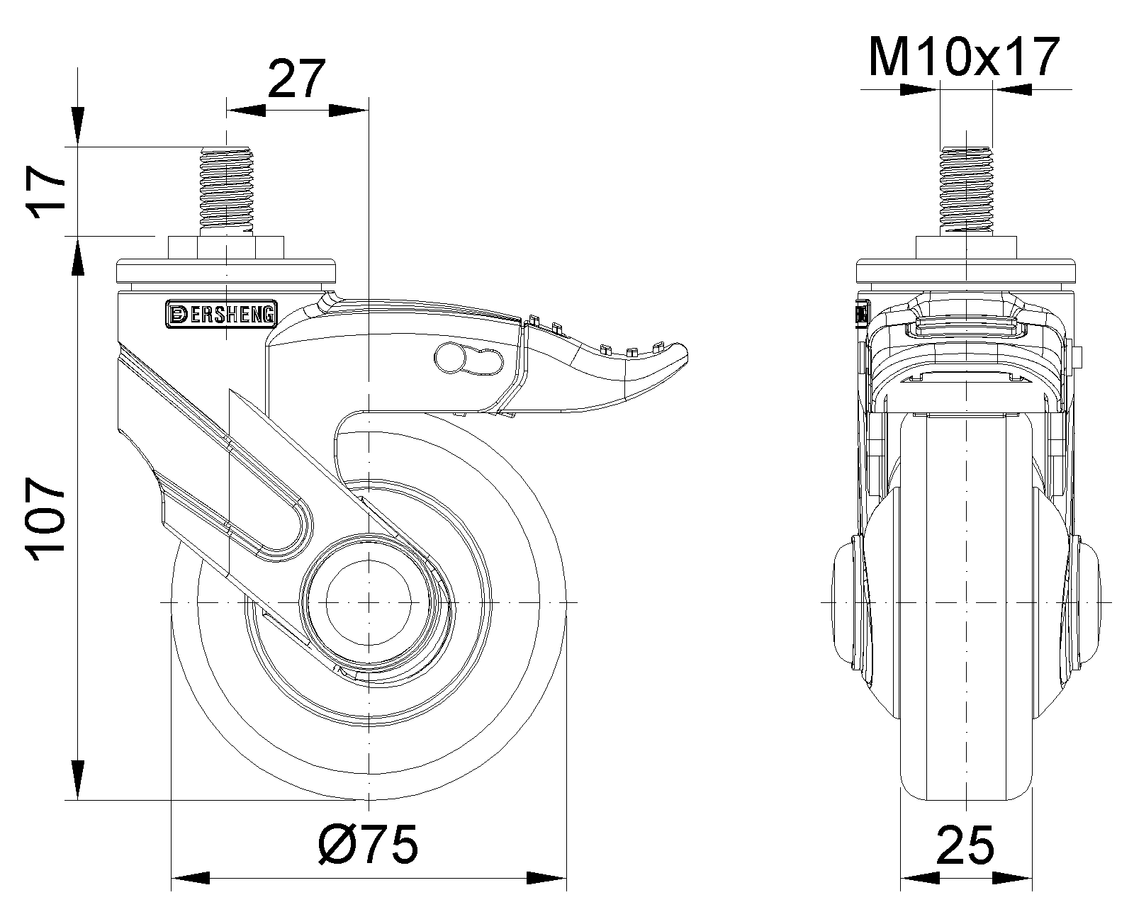 Bánh xe với hệ thống khóa kép dài, ren M10x17 Chân đen được gia cố bằng polyamide, lắp ren Chống gỉ, chống ăn mòn, thẩm mỹ, tiết kiệm và xoay linh hoạt Lõi bánh xe bằng polypropylene chống va đập, bề mặt bánh xe bằng nhựa nhiệt dẻo đàn hồi (TPR) Bánh xe màu đen, loại ống tâm |