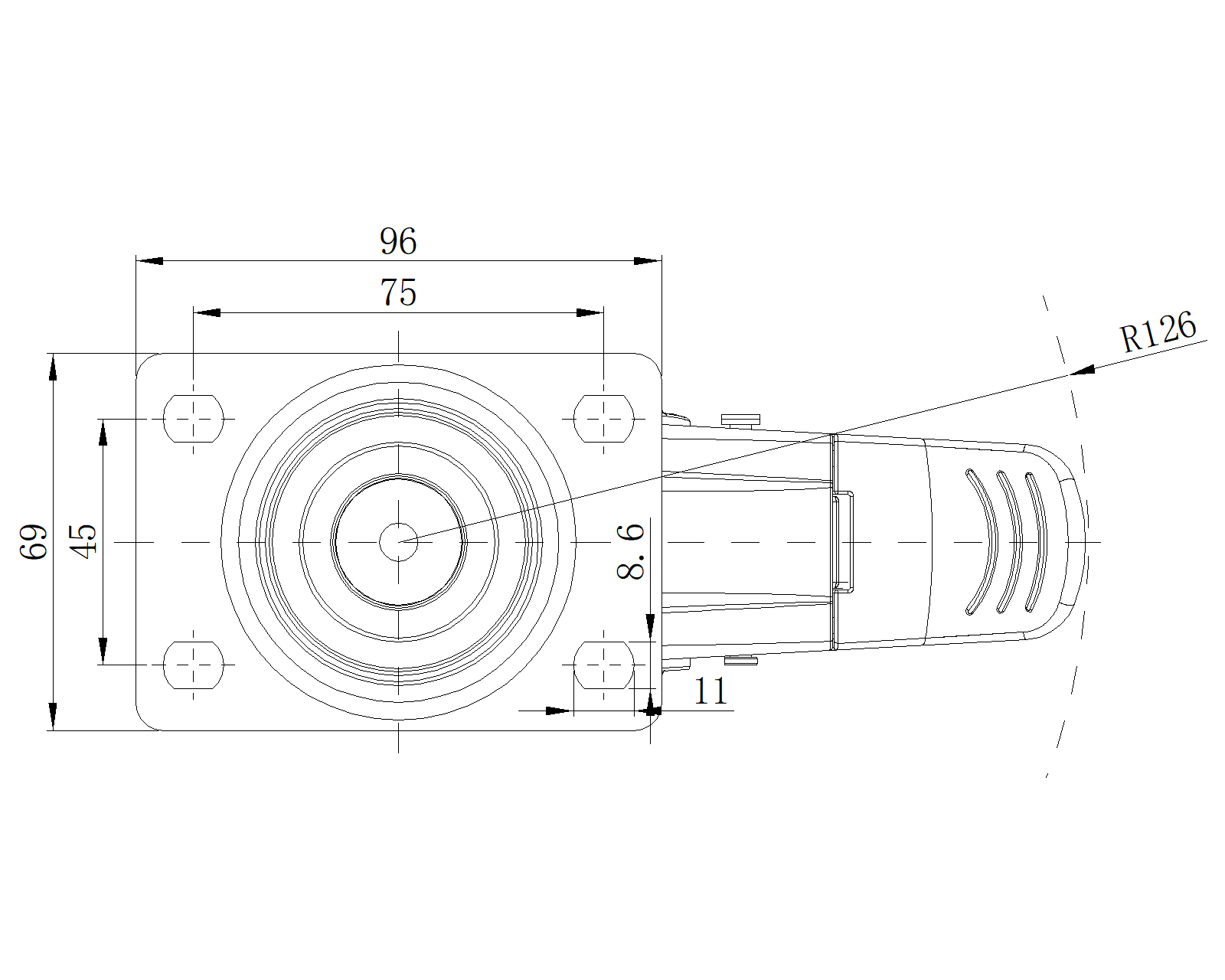 Bánh xe có hệ thống khóa phanh định hướng, đế lỗ góc 75x45 Chân màu đen làm bằng vật liệu gia cố polyamide, lắp đế Chống gỉ, chống ăn mòn, thẩm mỹ, tiết kiệm và xoay linh hoạt Lõi bánh xe bằng polypropylene chống va đập, bề mặt bánh xe bằng nhựa nhiệt dẻo đàn hồi (TPR) Vòng bi bánh xe màu đen—vòng bi chính xác |