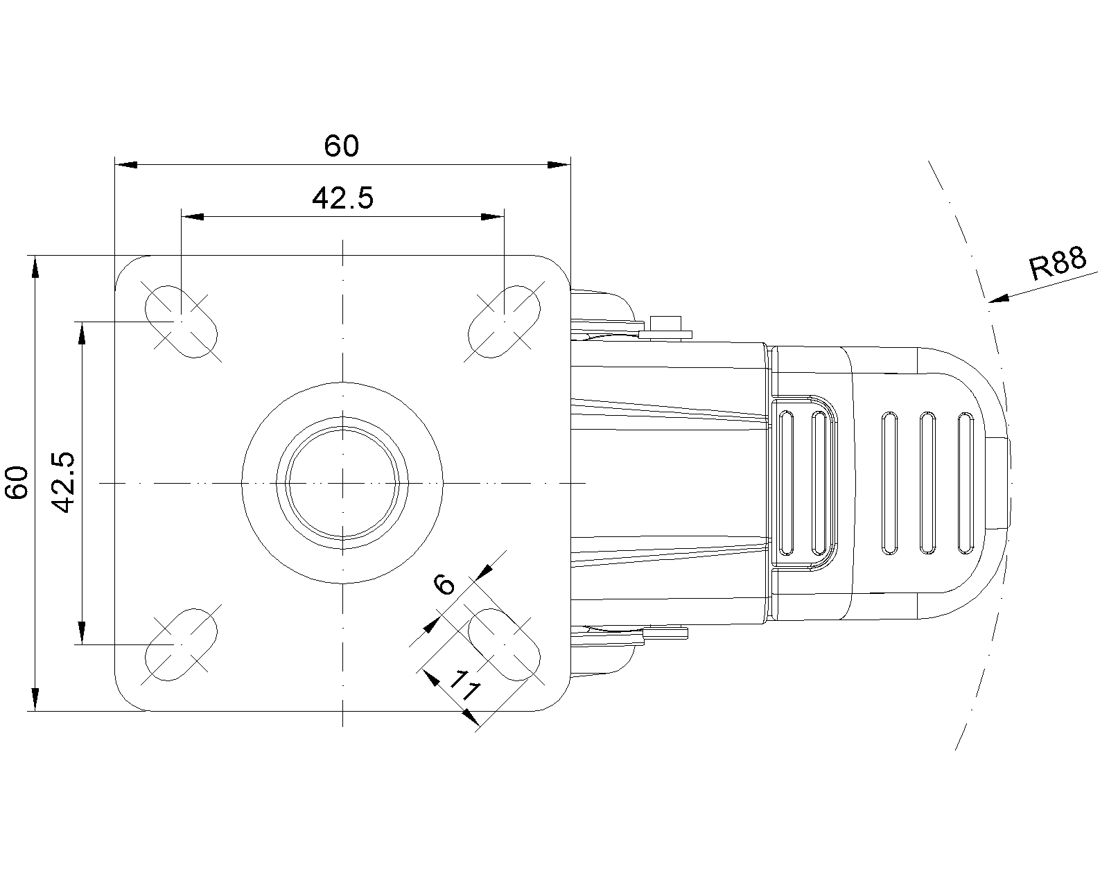 Bánh xe với hệ thống khóa phanh kép dài, đế cao cấp—đế lỗ góc 42,5x42,5 Chân màu đen làm bằng vật liệu gia cố polyamide, lắp đế Chống gỉ, chống ăn mòn, thẩm mỹ, tiết kiệm và xoay linh hoạt Lõi bánh xe bằng polypropylene chống va đập, bề mặt bánh xe bằng nhựa nhiệt dẻo đàn hồi (TPR) Bánh xe màu đen—loại ống trung tâm |