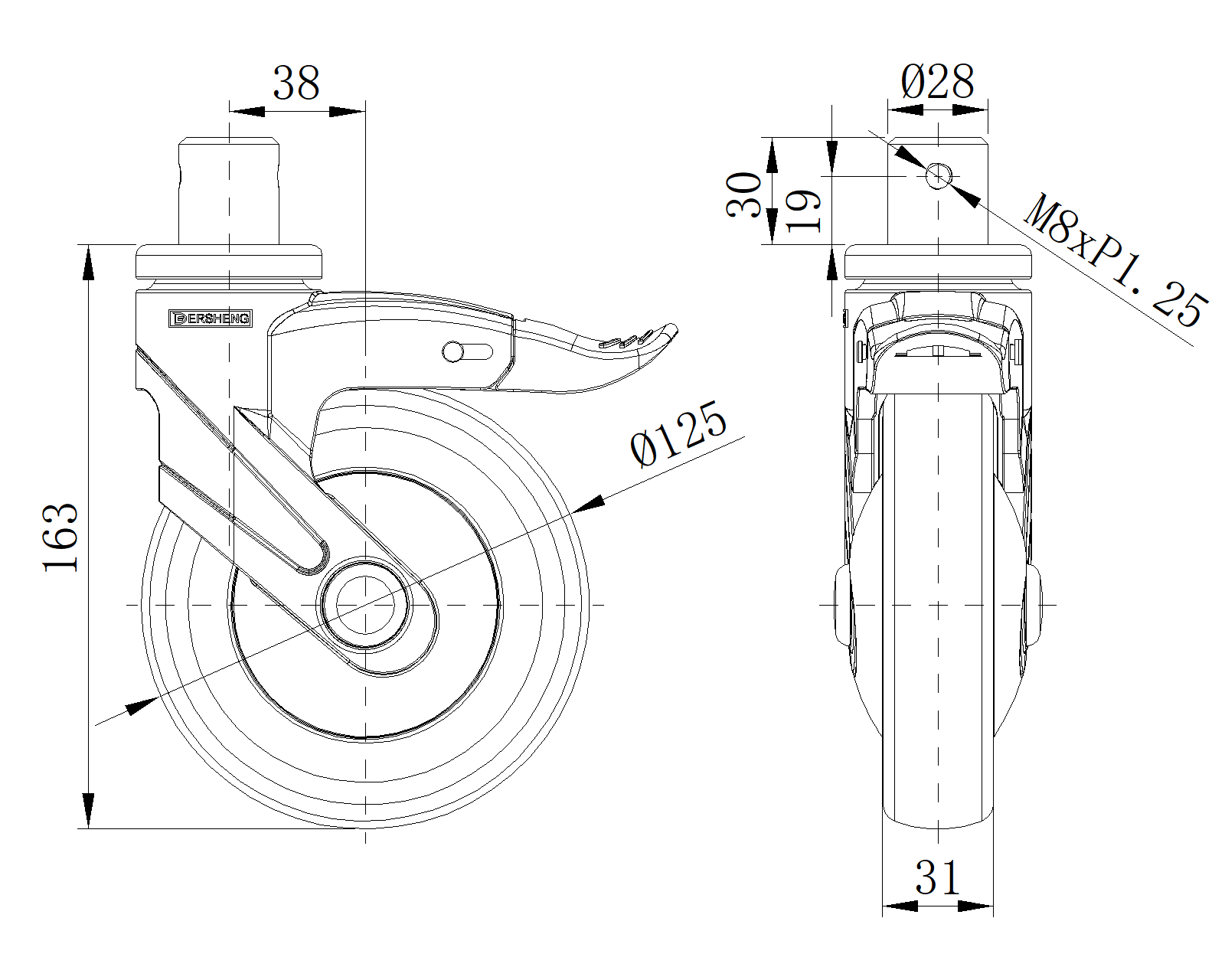 | PPR Bánh xe (đen) Đường kính bánh xe × Chiều rộng bánh xe 125 x 31mm |