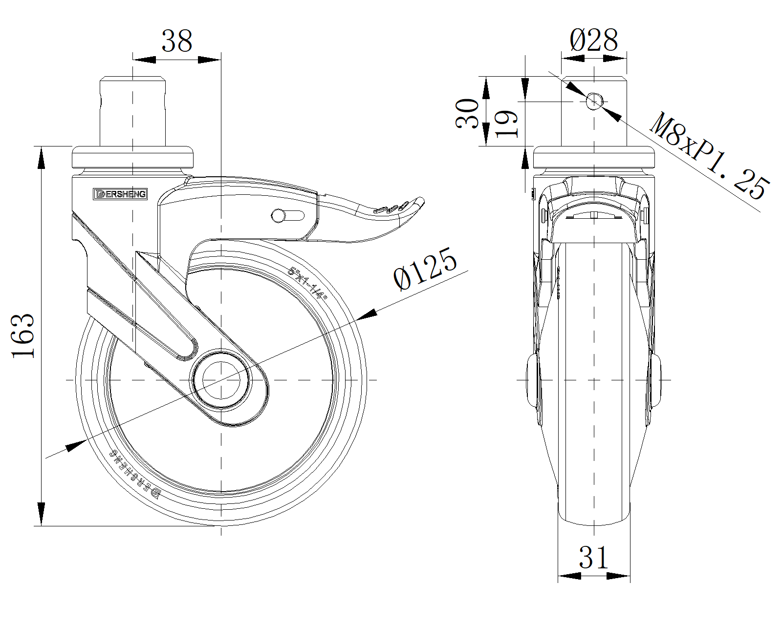 Bánh xe có hệ thống khóa phanh định hướng, chốt định vị Ø28x30L Chân bánh xe màu đen làm bằng vật liệu gia cố polyamide, lắp chốt định vị. Chống gỉ, chống ăn mòn, thẩm mỹ, tiết kiệm và cho phép xoay trơn tru. Lõi bánh xe bằng polypropylen chống va đập, bề mặt bánh xe bằng nhựa nhiệt dẻo đàn hồi (TPR). Vòng bi bánh xe màu đen—vòng bi chính xác. |