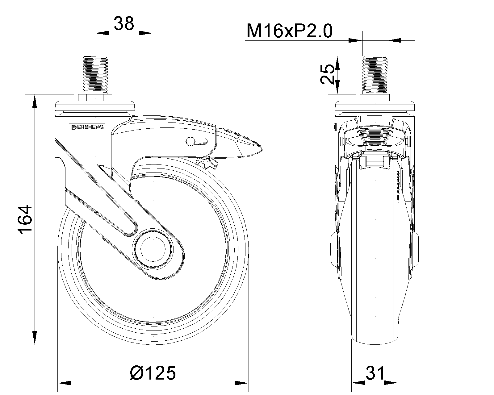 | Bánh xe dài loại phanh kép, hệ thống khóa, ren M16x25 Đế làm bằng nhựa polyamide gia cường, lắp đặt bằng ren Chống gỉ, chống ăn mòn, đẹp, tiết kiệm và xoay linh hoạt Lõi bánh xe bằng polypropylene chịu va đập, bề mặt bánh xe bằng chất đàn hồi nhiệt dẻo (TPR) Màu xám đậm, vòng bi bánh xe - vòng bi cầu chính xác |