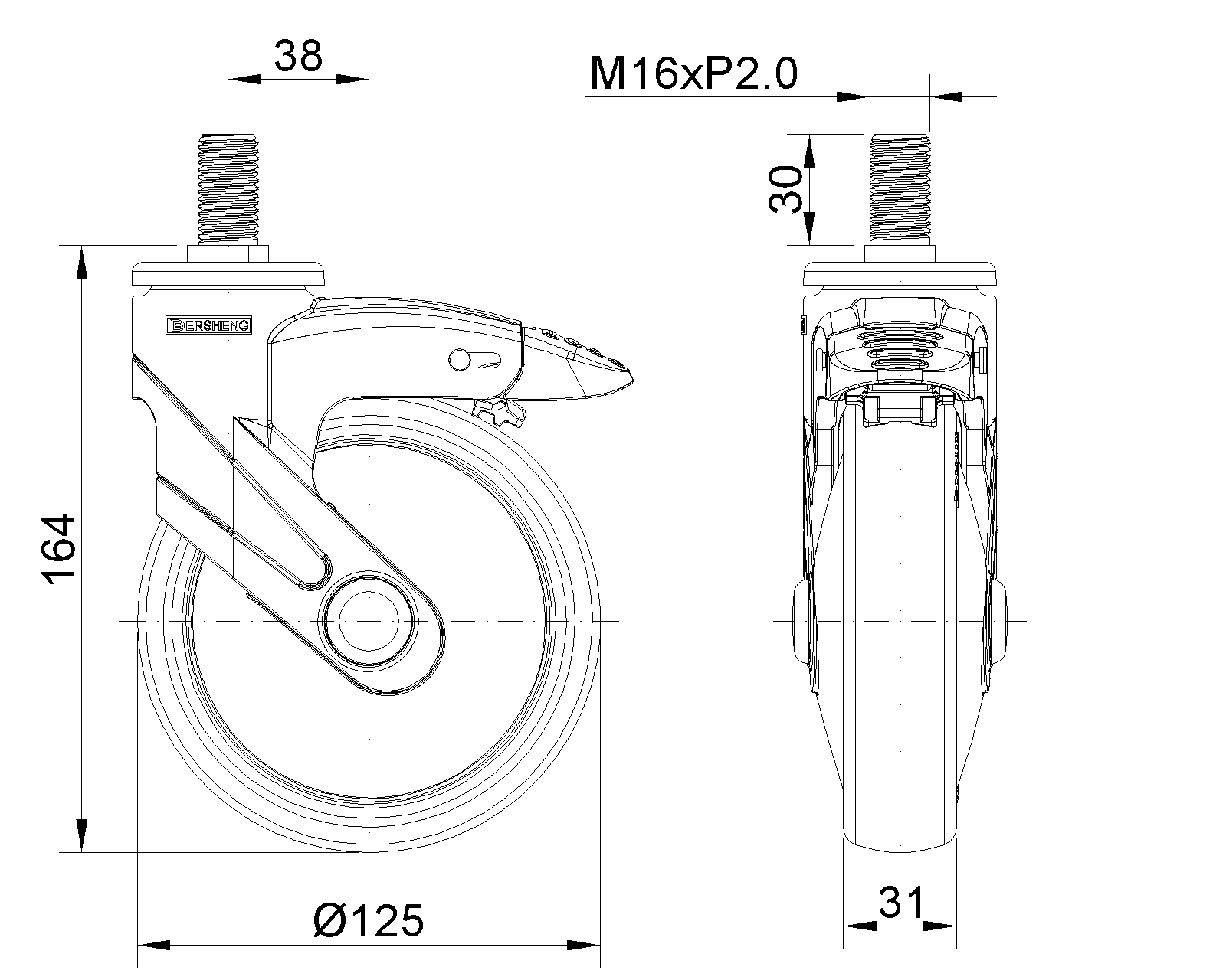 | Bánh xe dài loại phanh kép, hệ thống khóa, ren M16x30 Đế làm bằng vật liệu polyamide gia cường, lắp đặt bằng ren Chống gỉ, chống ăn mòn, đẹp, tiết kiệm và xoay linh hoạt Lõi bánh xe bằng polypropylene chịu va đập, bề mặt bánh xe bằng chất đàn hồi nhiệt dẻo (TPR) Màu xám đậm, vòng bi bánh xe - vòng bi cầu chính xác |