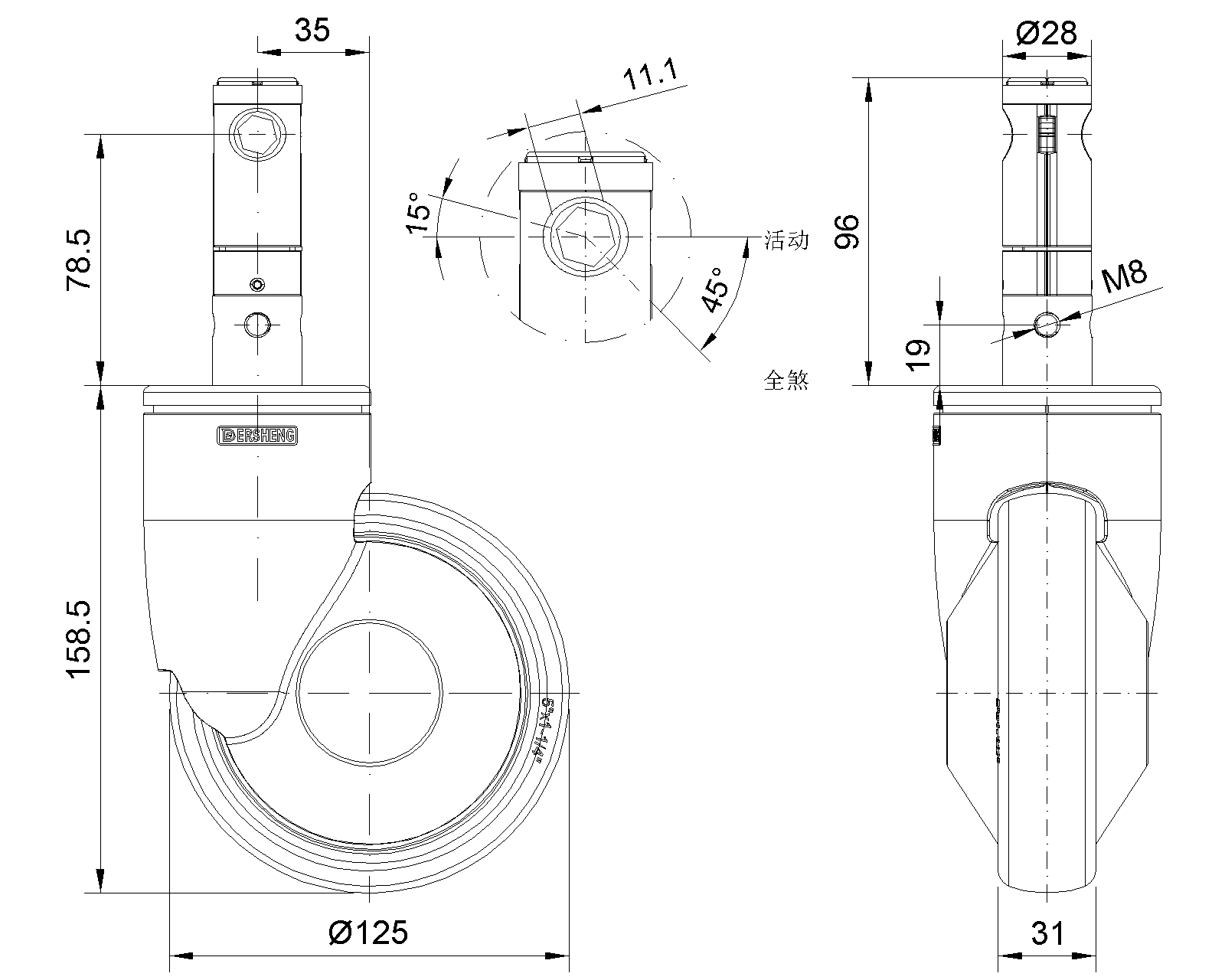 | Cổ điển PPR Bánh xe (trắng đen xám) Đường kính bánh xe × Chiều rộng bánh xe 125 x 31mm |
