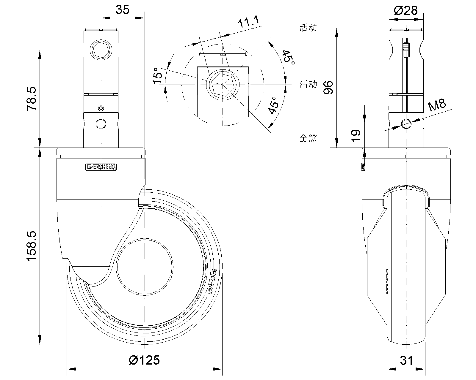| Cổ điển PPR Bánh xe (trắng đen xám) Đường kính bánh xe × Chiều rộng bánh xe 125 x 31mm |