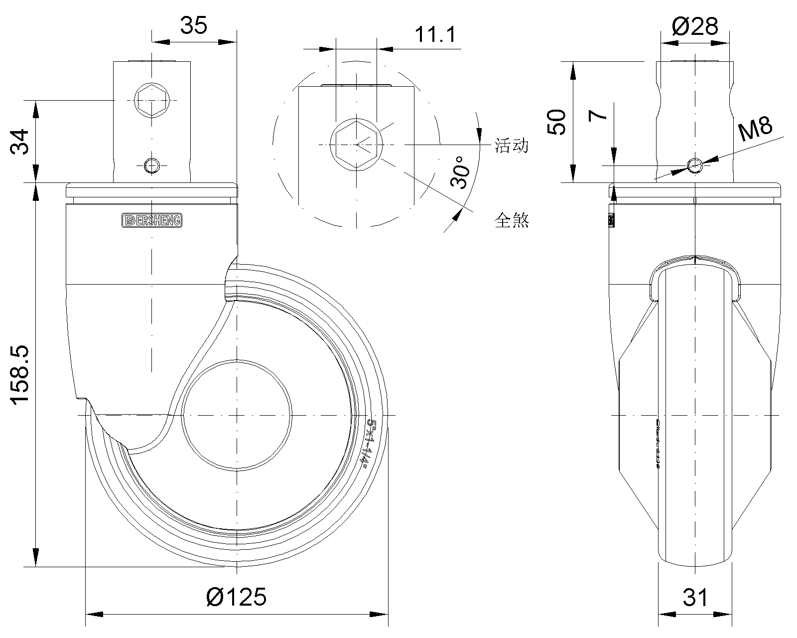 | Cổ điển PPR Bánh xe (trắng đen xám) Đường kính bánh xe × Chiều rộng bánh xe 125 x 31mm |