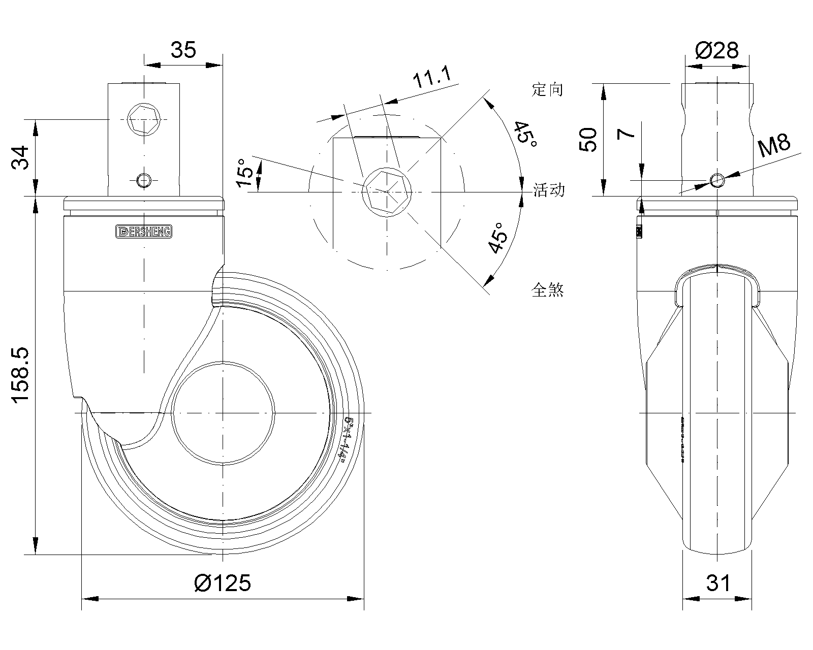 Điều khiển cam lỗ lục giác cần gạt ngắn, phanh khóa trung tâm toàn phần hoặc phanh định hướng. Chân thép, vỏ trang trí bên ngoài màu trắng. Chống gỉ, chống ăn mòn, thẩm mỹ và quay trơn tru. Lõi bánh xe bằng polypropylene chống va đập, bề mặt bánh xe bằng nhựa nhiệt dẻo đàn hồi (TPR). Vòng bi bánh xe màu xám đậm—vòng bi chính xác. |