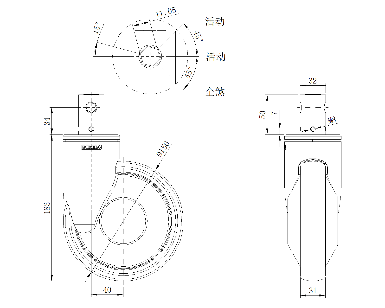 | Lỗ lục giác thanh ngắn, điều khiển bằng cam, khóa tâm, phanh toàn phần hoặc bánh xe di động