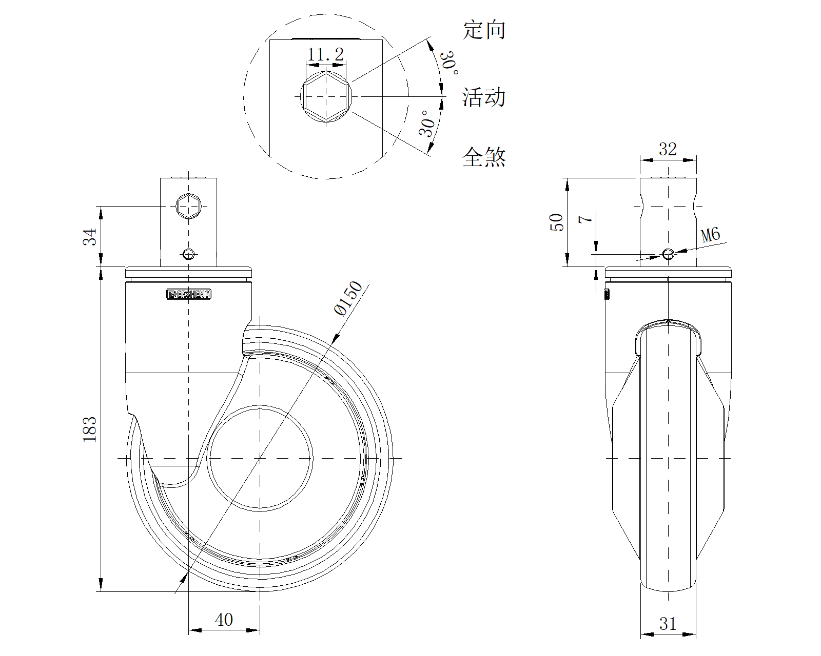 | Bánh xe với bộ điều khiển cam lỗ lục giác thanh ngắn, khóa tâm, phanh toàn phần hoặc phanh định hướng.