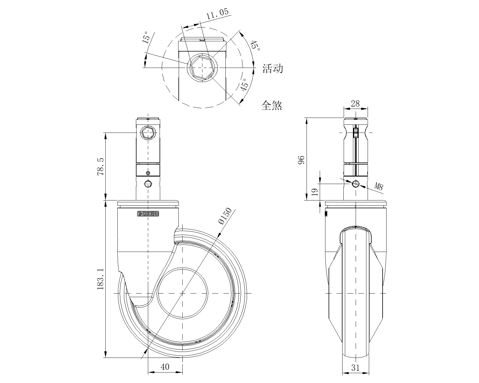 | Bánh xe hiệu ứng đầy đủ (trắng và xám đậm) Đường kính bánh xe × Chiều rộng bánh xe 150 x 31mm |