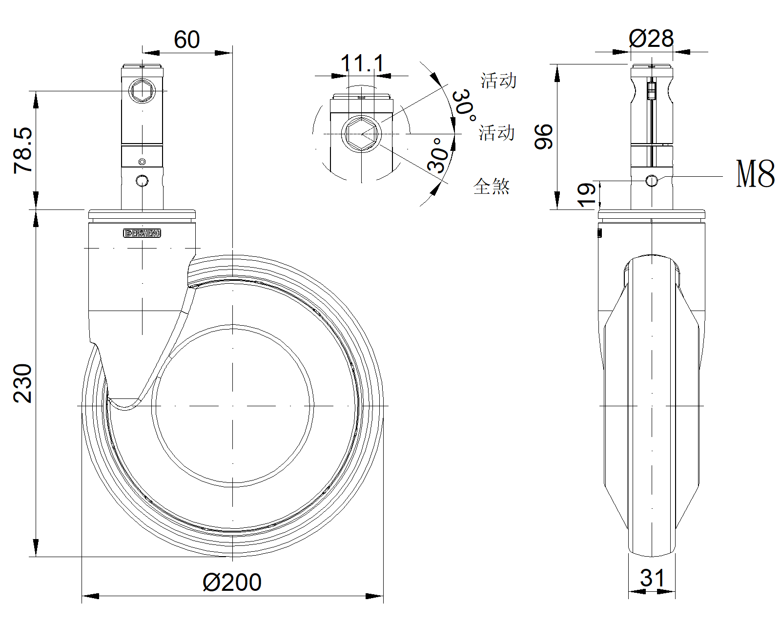 | PPR Bánh xe (trắng đen xám) Đường kính bánh xe × Chiều rộng bánh xe 200 x 31mm |