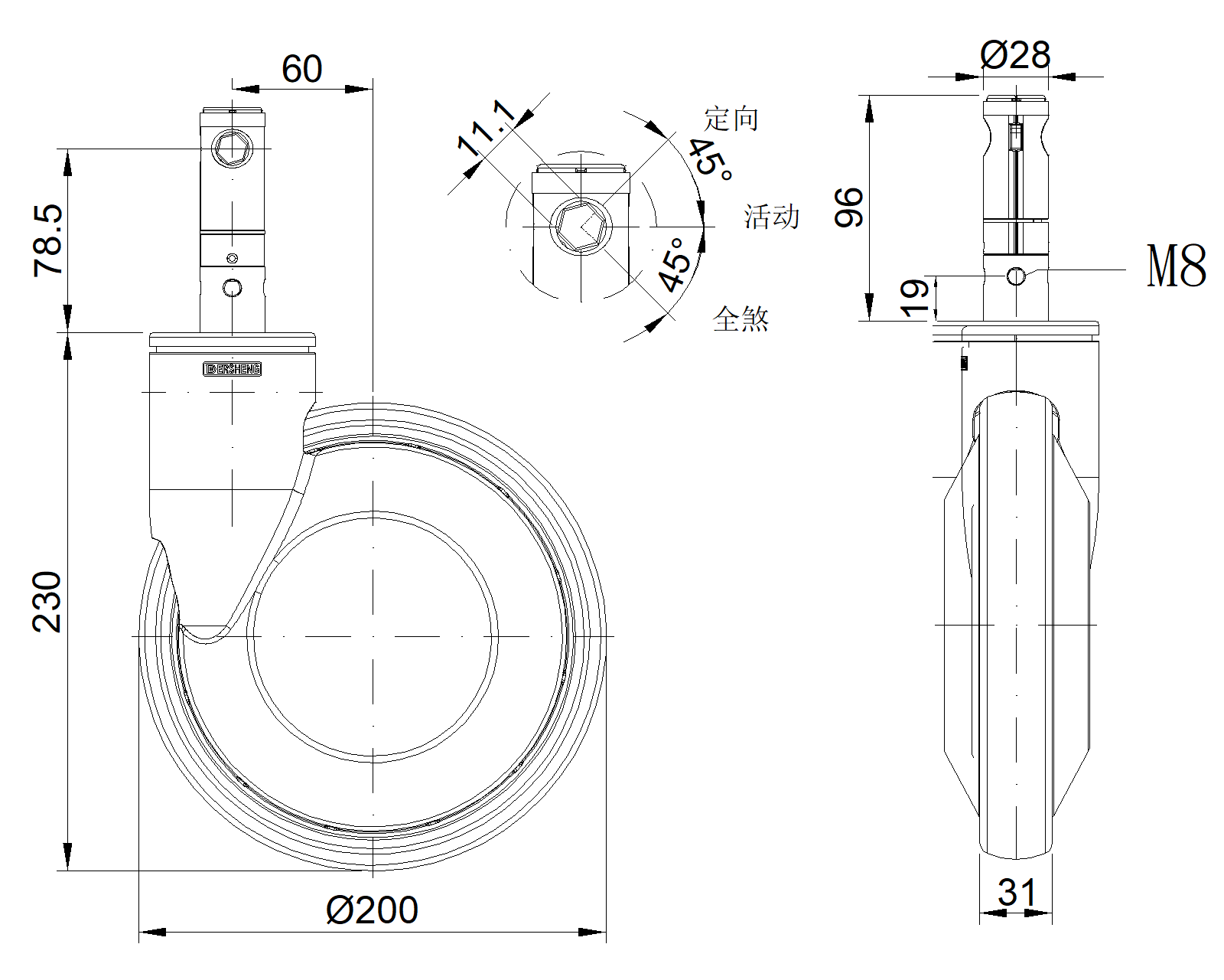 | PPR Bánh xe (trắng đen xám) Đường kính bánh xe × Chiều rộng bánh xe 200 x 31mm |