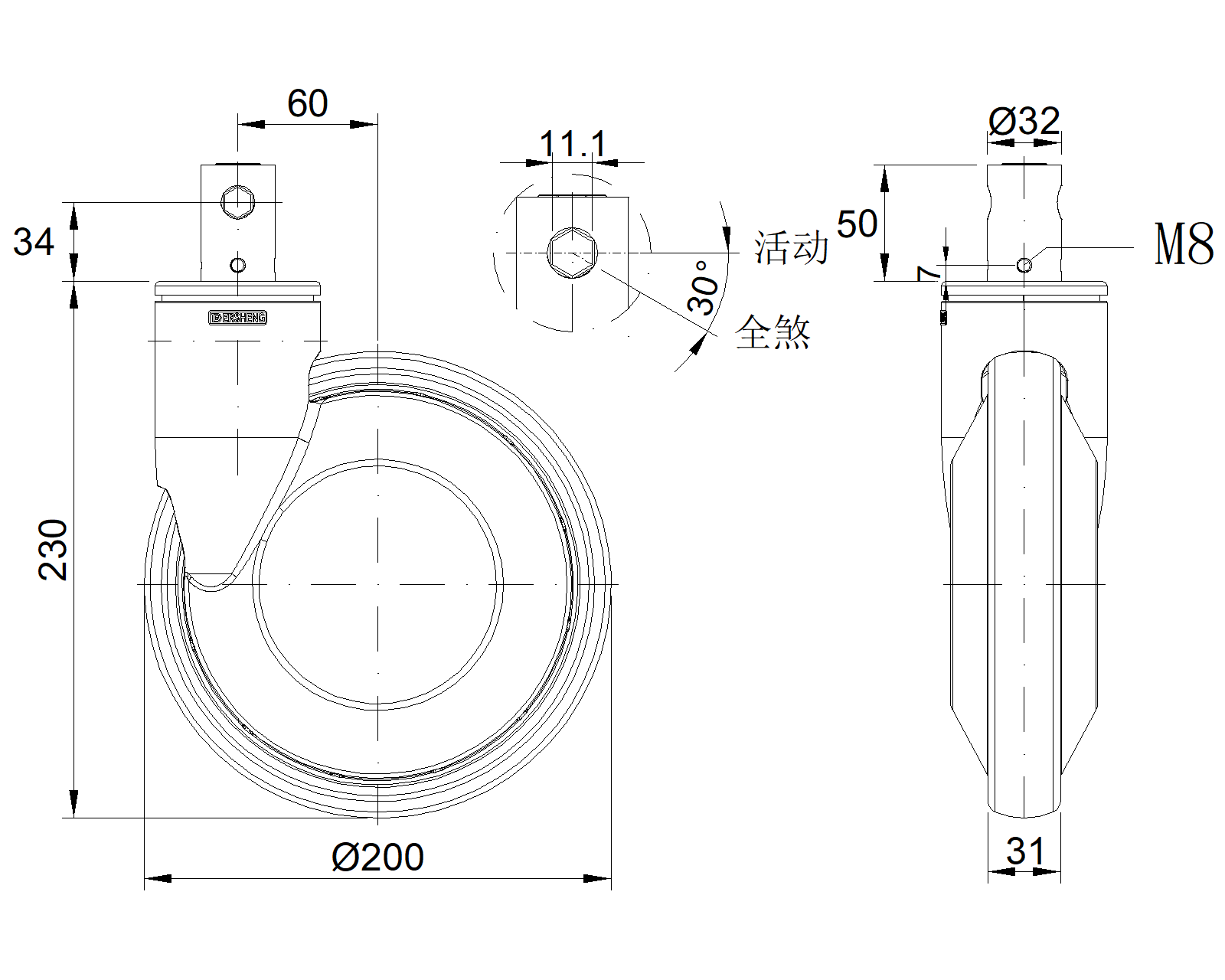 | PPR Bánh xe (trắng đen xám) Đường kính bánh xe × Chiều rộng bánh xe 200 x 31mm |