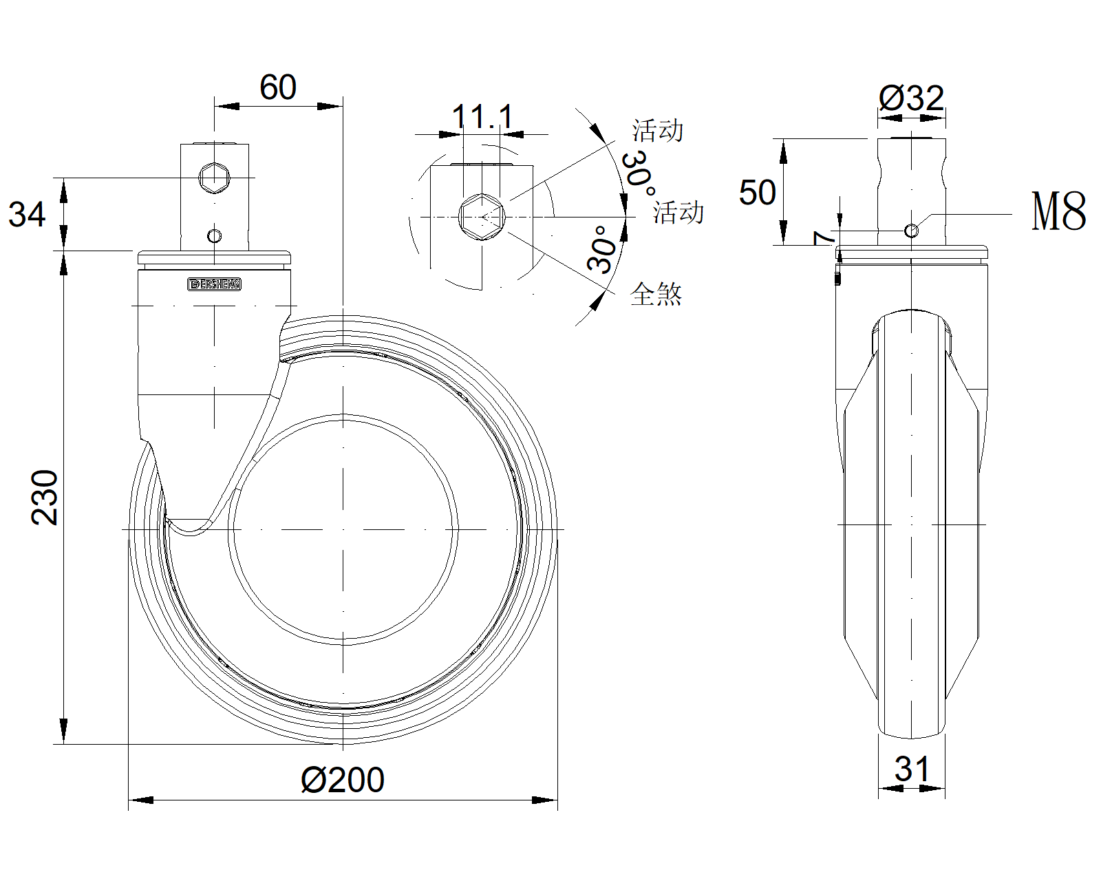 | PPR Bánh xe (trắng đen xám) Đường kính bánh xe × Chiều rộng bánh xe 200 x 31mm |