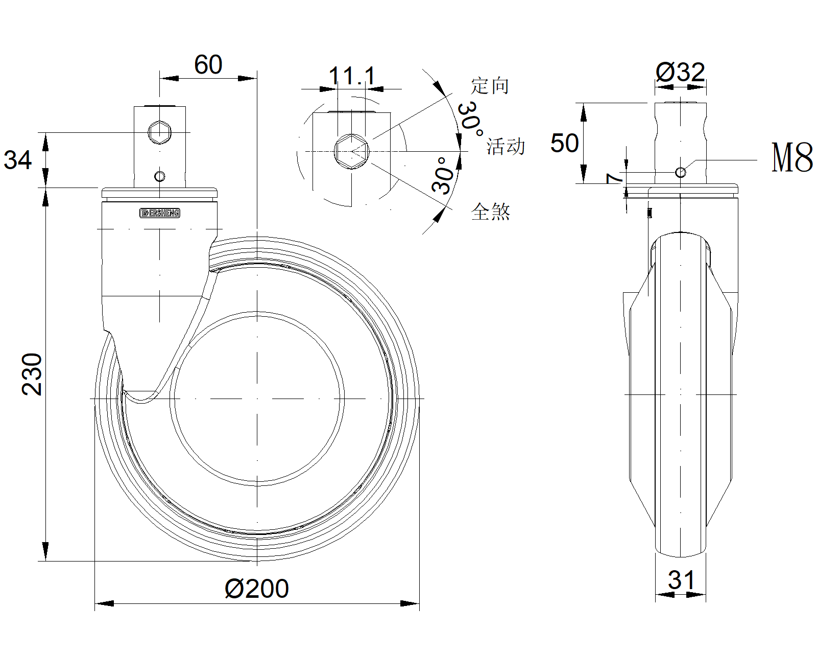 | PPR Bánh xe (trắng đen xám) Đường kính bánh xe × Chiều rộng bánh xe 200 x 31mm |