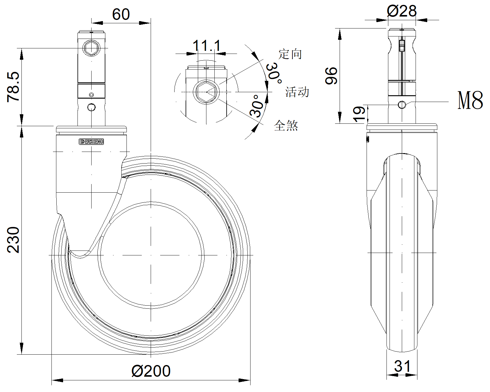 | Bánh xe hiệu ứng đầy đủ (trắng và xám đậm) Đường kính bánh xe × Chiều rộng bánh xe 200 x 31mm |