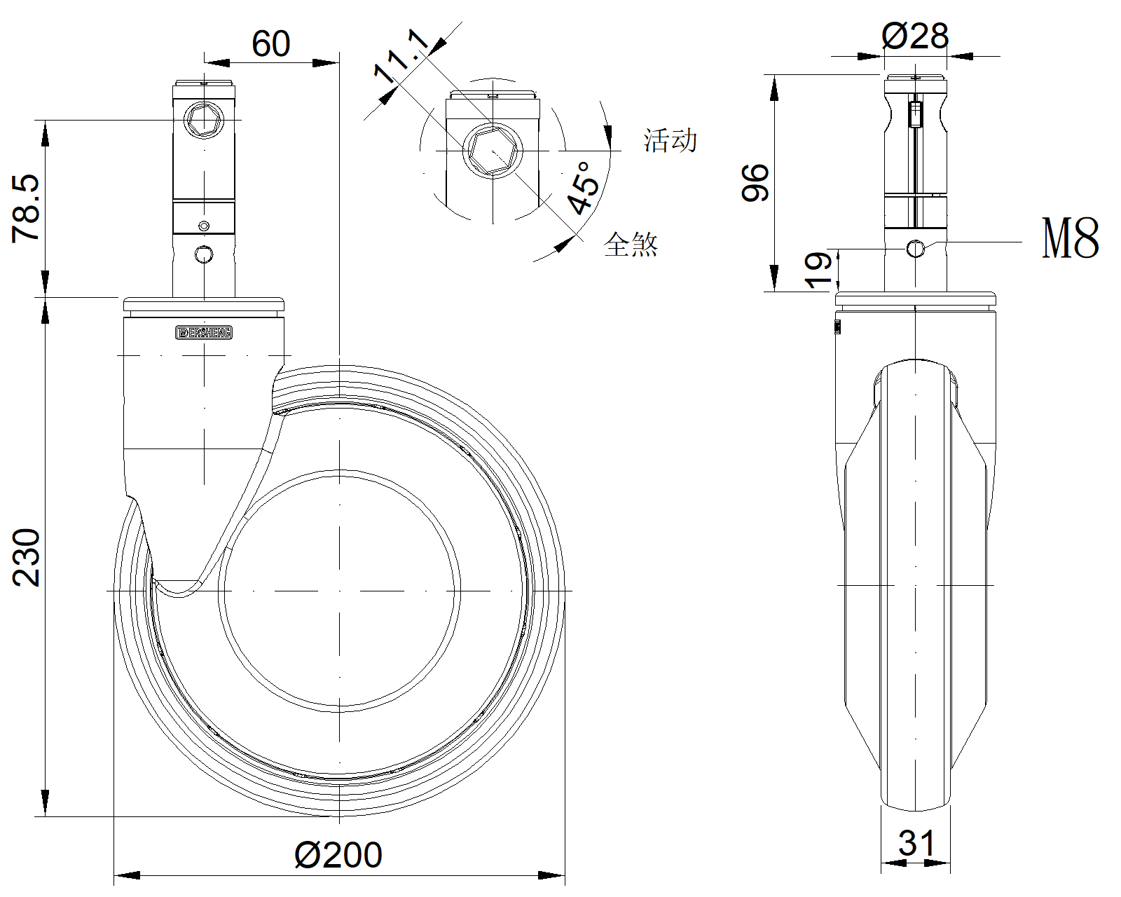 | Bánh xe hiệu ứng đầy đủ (trắng và xám đậm) Đường kính bánh xe × Chiều rộng bánh xe 200 x 31mm |