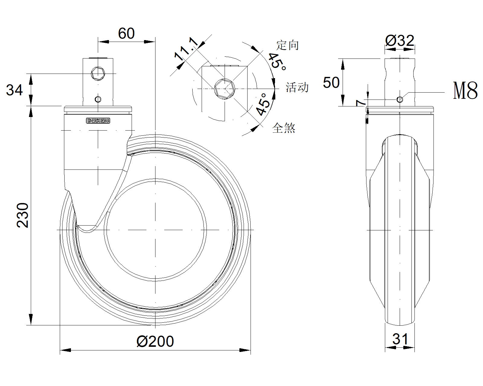 | Bánh xe hiệu ứng đầy đủ (trắng và xám đậm) Đường kính bánh xe × Chiều rộng bánh xe 200 x 31mm |