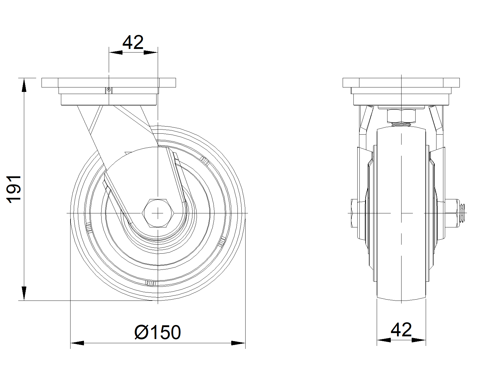 底板式安装装置, 孔距85 x 70 铸铁制轮芯,高品质聚氨酯轮面,铣褐色 轮子轴承—精密滚珠,配特制防缠绕轮盖 |