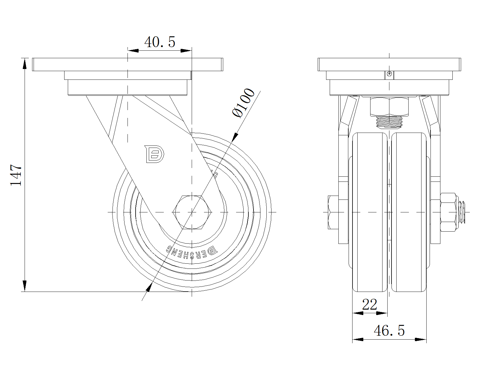 | Bánh xe ZQPU (hồ quang nâu) Đường kính bánh xe × Chiều rộng bánh xe 100 x 22 (46,5) mm |