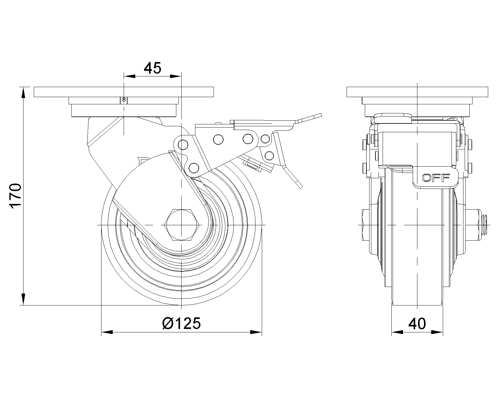 | Bánh xe PU(bánh phẳng màu đỏ) đường kính bánh xe × chiều rộng bánh xe là 125 × 40 mm. |