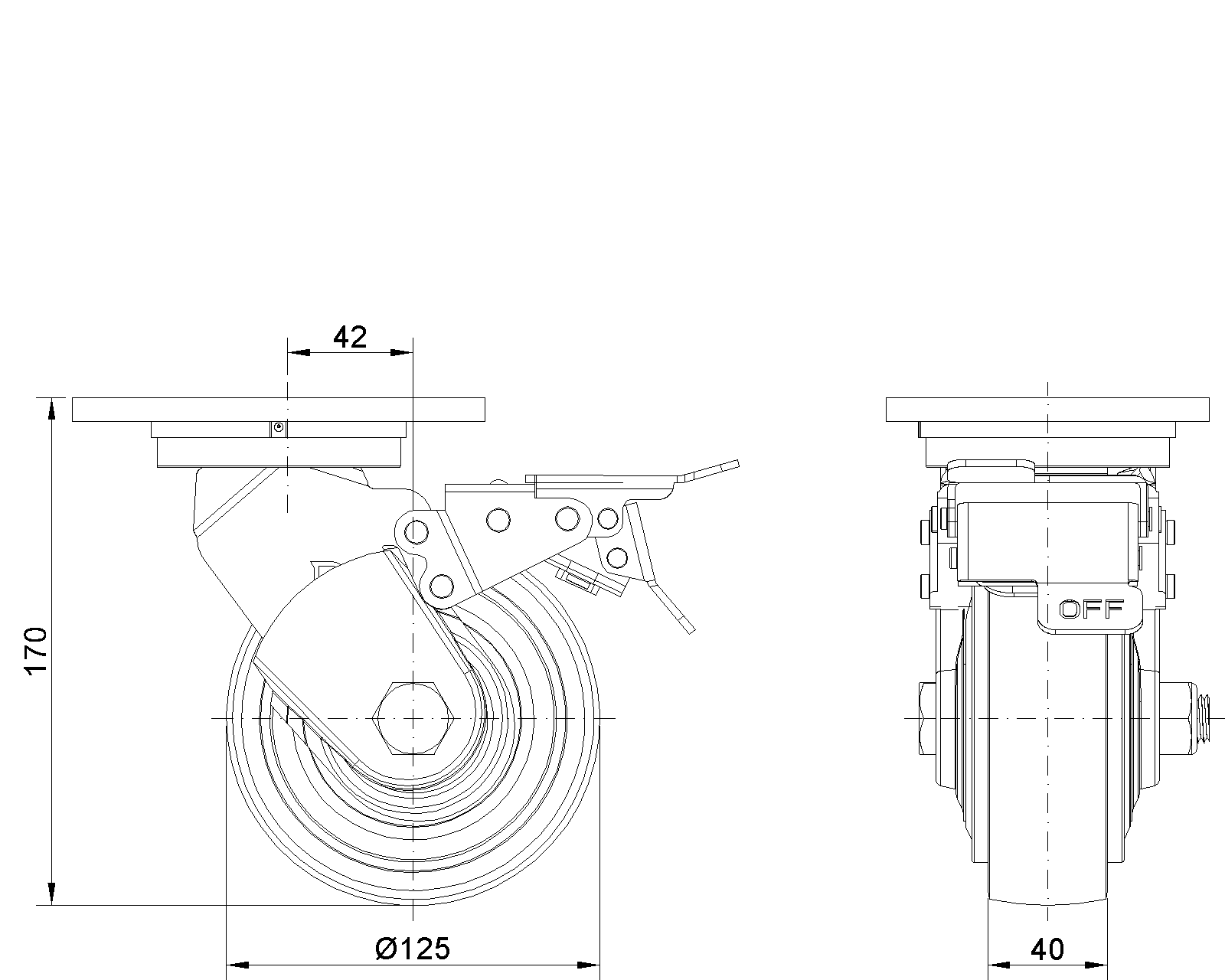 Trang bị phanh trước, bánh xe có hệ thống khóa, khung thép hàn Sơn màu đỏ, lắp đặt bằng tấm đế, khoảng cách lỗ 110x75mm Lõi bánh xe bằng nhựa nhiệt dẻo, màu bề mặt bánh xe tự nhiên Vòng bi bánh xe—vòng bi cầu chính xác |