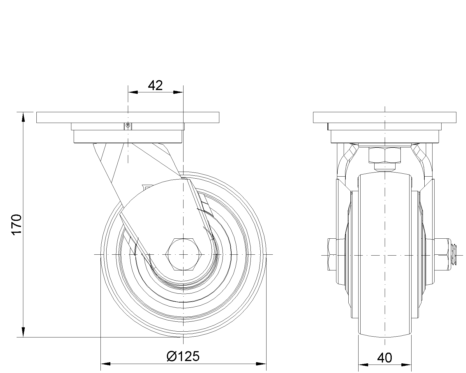 Thiết bị gắn đế, khoảng cách lỗ 110x75mm. Lõi bánh xe bằng nhựa nhiệt dẻo, bề mặt bánh xe màu tự nhiên. Vòng bi bánh xe—vòng bi cầu chính xác, được trang bị nắp chống xoắn đặc biệt. |
