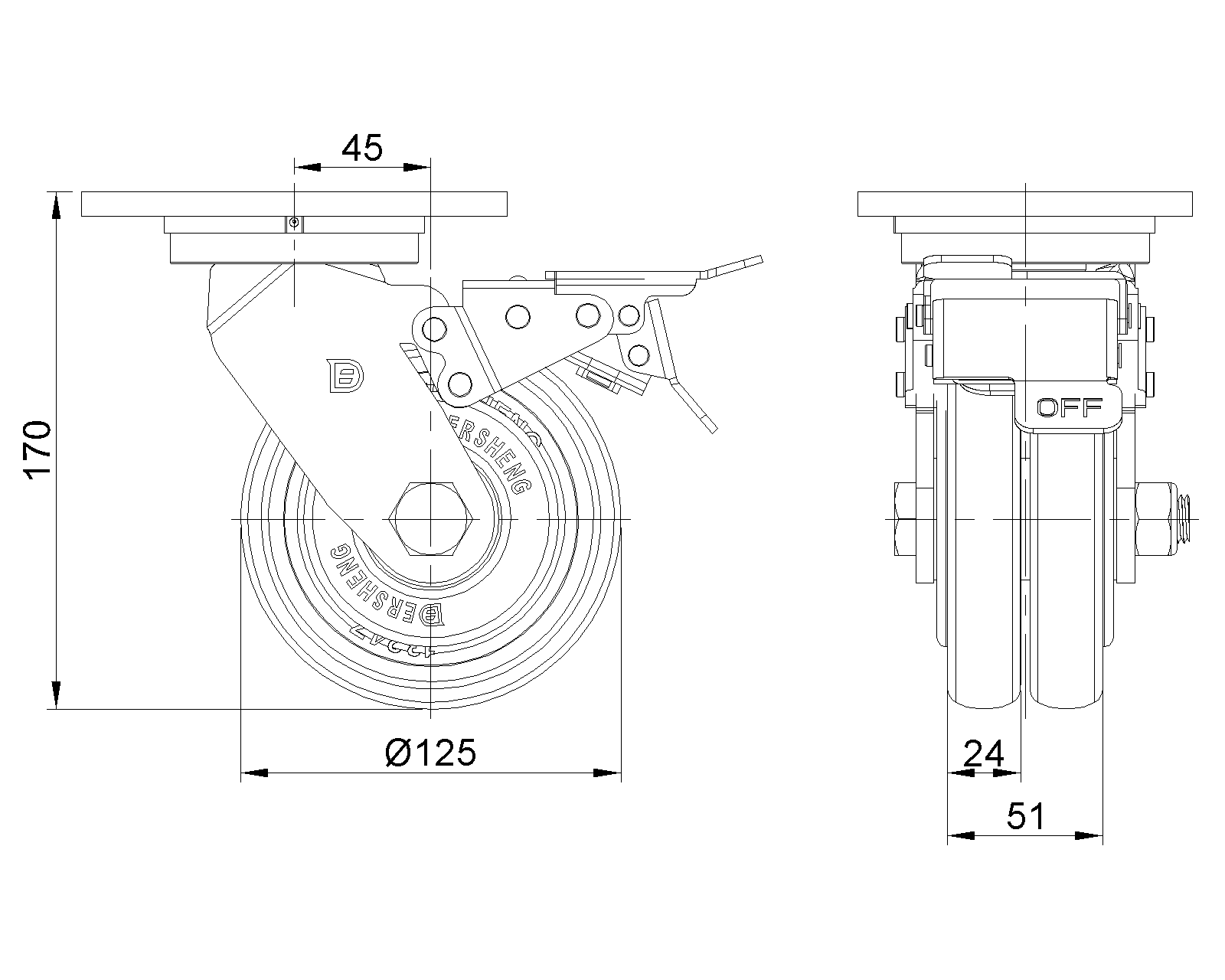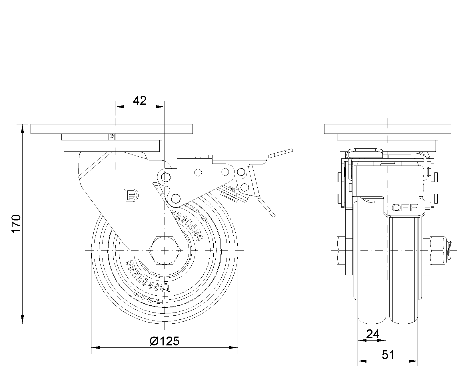 | Bánh xe ZQPU (hồ quang nâu) Đường kính bánh xe × Chiều rộng bánh xe 125 x 24 (51) mm |