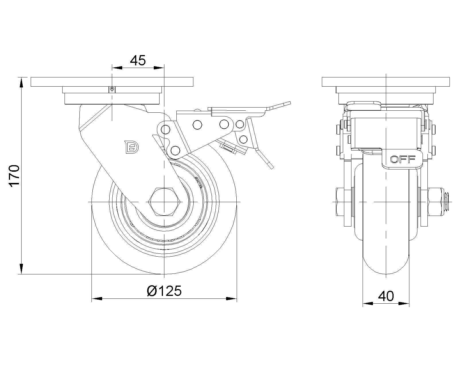| Bánh xe EQPU (hồ quang nâu) Đường kính bánh xe × Chiều rộng bánh xe 125 x 40mm |