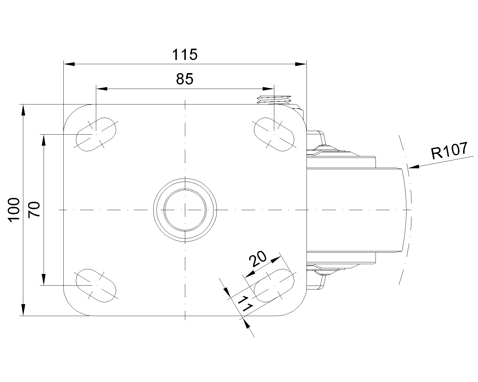 Quy cách tấm lắp 115 x 100mm khoảng cách các lỗ trên tấm nền 85 x 70mm Khoảng cách các lỗ lắp 20 x 11mm Độ lệch tâm 42mm Sự can thiệp quay 214mm Tổng chiều cao 170mm Bán kính xoay 107mm Độ cứng 93±5° Shore A Tải trọng (động) 340kgs |
