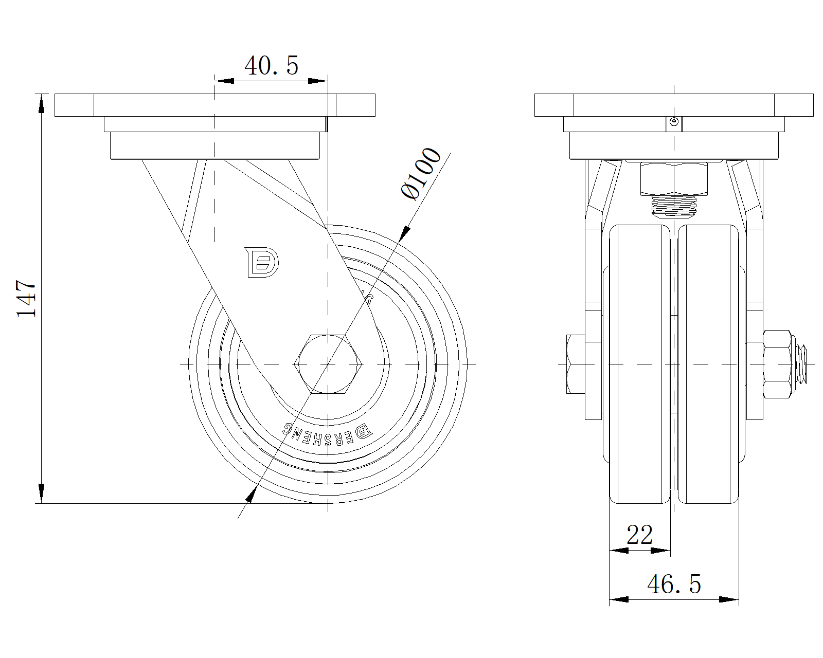 | Bánh xe ZQPU (hồ quang nâu) Đường kính bánh xe × Chiều rộng bánh xe 100 x 22 (46,5) mm |