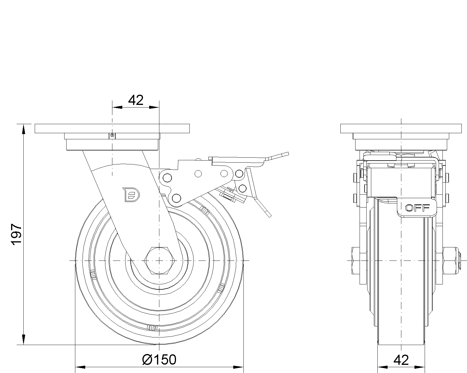 Đặc điểm: Phanh trước, bánh xe có khóa; khung thép hàn. Sơn màu đỏ; lắp đặt bằng tấm đế; khoảng cách lỗ 110x75mm. Lõi bánh xe bằng gang; bề mặt bánh xe bằng polyurethane chất lượng cao; lớp sơn đỏ được gia công. Vòng bi bánh xe—vòng bi cầu chính xác. |