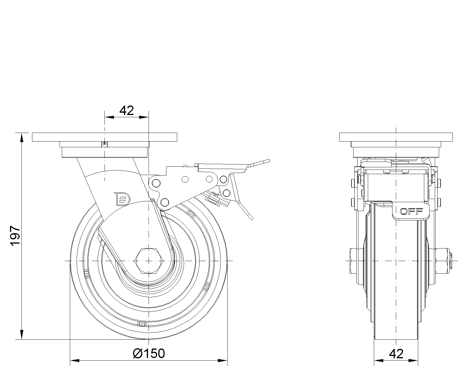 Đặc điểm nổi bật: Phanh trước, bánh xe có khóa, khung thép hàn. Sơn màu đỏ, lắp đặt bằng tấm đế, khoảng cách lỗ 110x75mm. Lõi bánh xe bằng gang, bề mặt bánh xe bằng polyurethane chất lượng cao, được phay màu đỏ. Vòng bi chính xác, với nắp bánh xe chống xoắn được thiết kế đặc biệt. |
