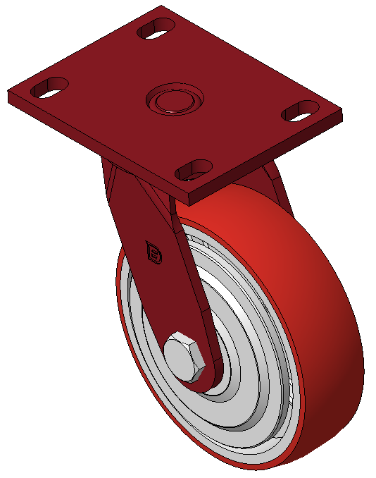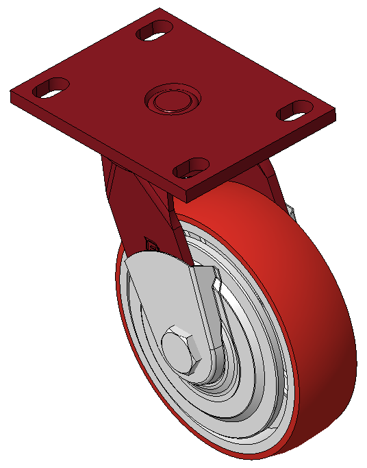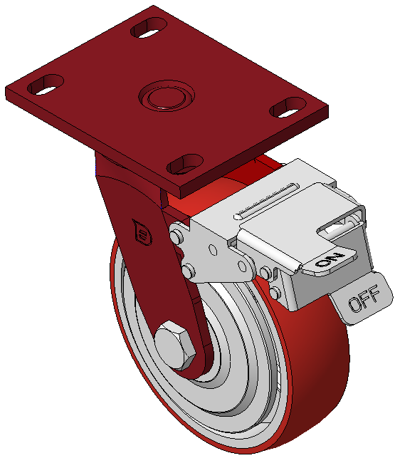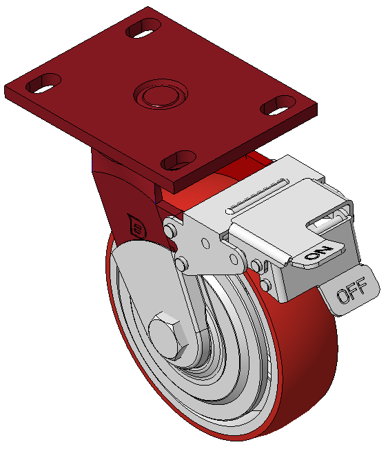 Đặc điểm nổi bật: Phanh trước, bánh xe có khóa, khung thép hàn. Sơn màu đỏ, lắp đặt bằng tấm đế, khoảng cách lỗ 110x75mm. Lõi bánh xe bằng gang, bề mặt bánh xe bằng polyurethane chất lượng cao, được phay màu đỏ. Vòng bi chính xác, với nắp bánh xe chống xoắn được thiết kế đặc biệt. |